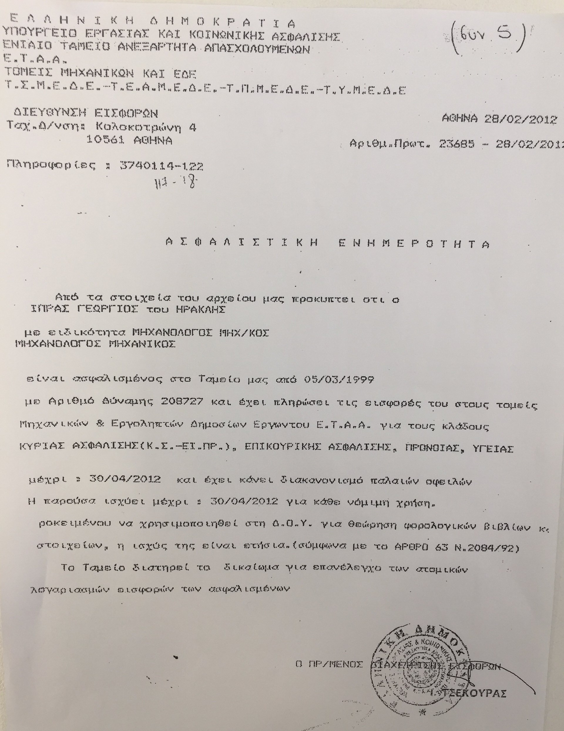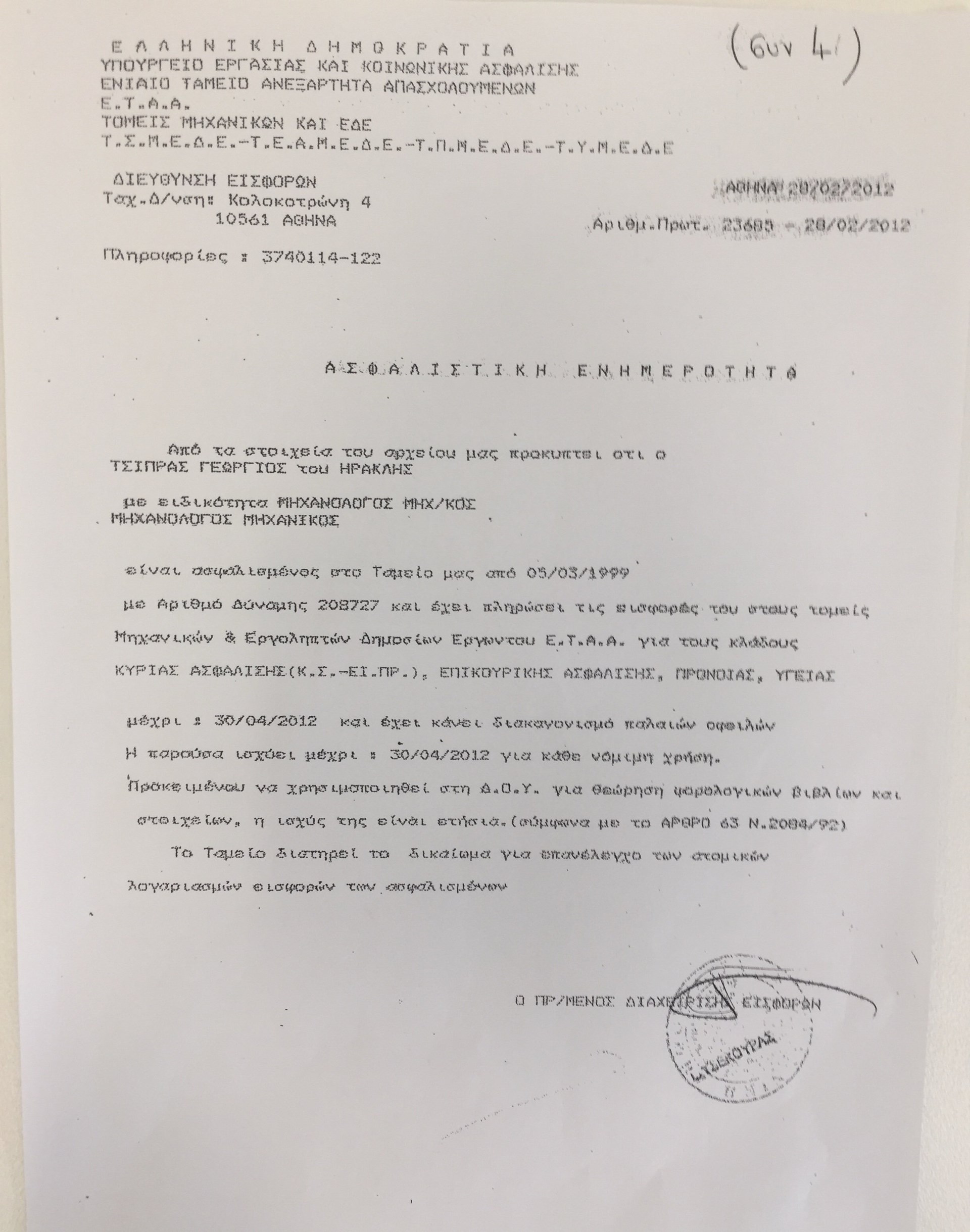 - Στο πλαίσιο διεκδίκησης δημοσίου έργου που προκήρυξε η περιφέρεια Βορείου Αιγαίου, ύψους 1,1 εκ ευρώ, η εταιρεία ΔΙΟΔΟΣ υπέβαλε το 2012 τα προαπαιτούμενα από το νόμο δικαιολογητικά. Mεταξύ αυτών ήταν και το επίμαχο έγγραφο της ασφαλιστικής ενημερότητας του κ. Γεωργίου Τσίπρα, ως υπεύθυνου μηχανικού της εταιρείας για την εκτέλεση του έργου, που προσκομίσθηκε σε φωτοτυπία. Το έγγραφο αυτό έφερε ημερομηνία έκδοσης την 28/2/2012. (βλ. έγγραφο 1).