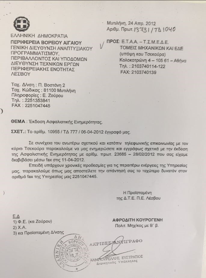 - Εξ αυτού του λόγου η Δ/νση Τεχνικών έργων της Περιφέρειας Βορείου Αιγαίου απευθύνει πλέον επισήμως στο Ε.Τ.Α.Α. – Τ.Σ.Μ.Ε.Δ.Ε., (που φερόταν να έχει εκδώσει τα εν λόγω έγγραφα), γραπτό ερώτημα για να διαλευκανθεί η υπόθεση (έγγραφο 3).