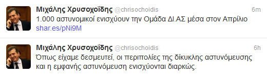 Ο υπουργός Προστασίας του Πολίτη, Μιχάλης Χρυσοχοίδης υλοποιεί τις πρόσφταες δεσμεύσεις του περί ενίσχυσης της αστυνόμευσης καθώς όπως ανακοίνωσε μέσα από το twitter του, θα ενισχύσει με 1.000 αστυνομικούς την ομάδα ΔΙ.ΑΣ μέσα στον Απρίλη: