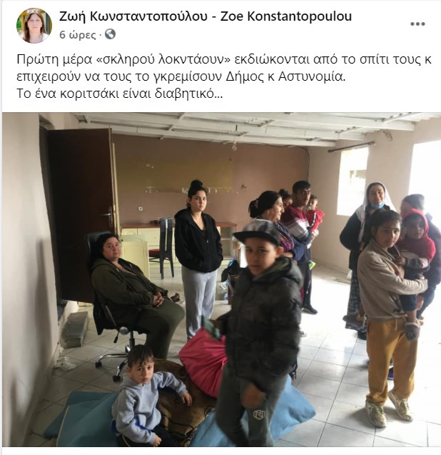 “Αυτή τη στιγμή συνεργεία του Δήμου Φυλής με σύμπραξη του Δημάρχου και της Αστυνομίας γκρεμίζουν το φτωχικό κατάλυμα μιας 20μελούς οικογένειας Ρομά, με 9 ανήλικα παιδιά, το μικρότερο 4χρονών και μια υπέργηρη γιαγιά, 90 ετών! Την πρώτη μέρα του «σκληρού λοκντάουν», στα μουλωχτά, ενώ απαγορεύεται κάθε οικοδομική δραστηριότητα. Ο Δήμαρχος είχε διαβεβαιώσει εμένα προσωπικά ότι δεν θα έκανε καμμία τέτοια ενέργεια που θα έθετε σε κίνδυνο την διαβίωση της οικογένειας και είχε ζητήσει αναβολή στα Δικαστήρια για να βρεθεί μια λύση” κατήγγειλε η Ζωή Κωνσταντοπούλου με ανάρτησή της στο Facebook.