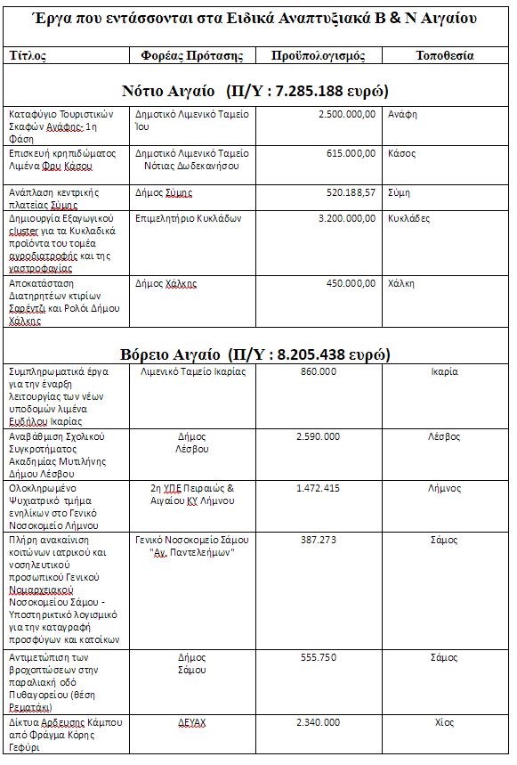 Με απόφαση του Αναπληρωτή Υπουργού Οικονομίας και Ανάπτυξης, Αλέξη Χαρίτση, εντάσσονται τα πρώτα έργα στα Ειδικά Αναπτυξιακά Προγράμματα Βορείου και Νοτίου Αιγαίου. Πρόκειται για τα προγράμματα που δημιούργησε το Υπουργείο Οικονομίας ειδικά για τις Περιφέρειες Βορείου και Νοτίου Αιγαίου και τα οποία θα στηρίξουν τα νησιά με επιπλέον εθνικούς πόρους ύψους 50 εκατ. ευρώ.