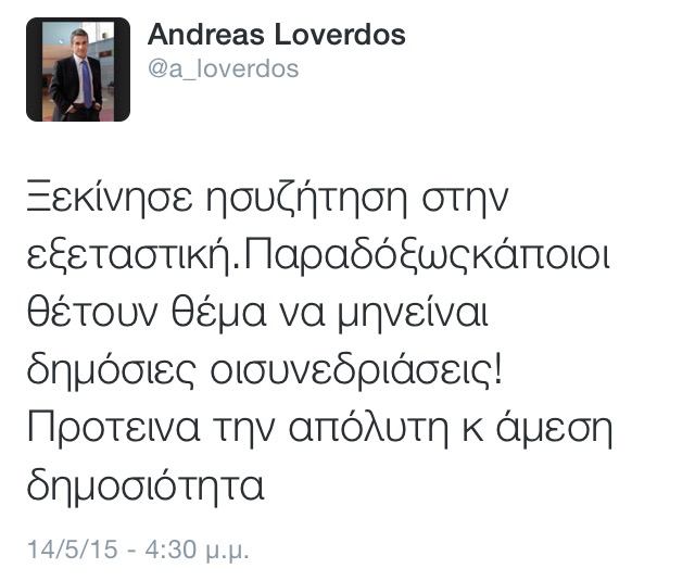 Ο βουλευτής του ΠΑΣΟΚ και μέλος της Επιτροπής Ανδρέας Λοβέρδος ανάρτησε πριν από λίγο στο twitter ότι ο ίδιος πρότεινε την απόλυτη και άμεση δημοσιότητα του θέματος.