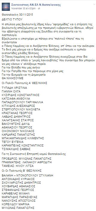 Η ανακοίνωση της συντονιστικής των ΑΝΕΛ Θεσσαλονίκης: