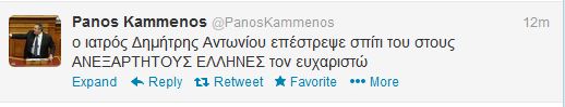 “O ιατρός Δημήτρης Αντωνίου επέστρεψε σπίτι του στους Aνεξάρτητους Έλληνες. Τον ευχαριστώ”.
