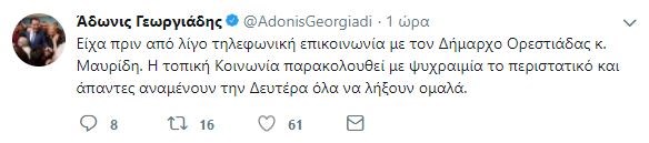 Τηλεφωνική επικοινωνία με τον Δήμαρχο Ορεστιάδας, Βασίλη Μαυρίδη για το θέμα των Ελλήνων στρατιωτικών είχε το βράδυ του Σαββάτου ο αντιπρόεδρος της ΝΔ, Άδωνις Γεωργιάδης, όπως γνωστοποίησε ο ίδιος σε ανάρτησή στον λογαριασμό του στο Twitter.