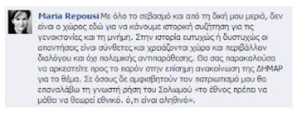 “Με όλο το σεβασμό και από τη δική μου μεριά, δεν είναι ο χώρος εδώ για να κάνουμε ιστορική συζήτηση για τις γενοκτονίες και τη μνήμη. Στην ιστορία ευτυχώς ή δυστυχώς οι απαντήσεις είναι σύνθετες και χρειάζονται….χώρο και περιβάλλον διαλόγου και όχι πολεμικής αντιπαράθεσης. Θα σας παρακαλούσα να αρκεστείτε προς το παρόν στην επίσημη ανακοίνωση της ΔΗΜΑΡ για το θέμα. Σε όσους δε αμφισβητούν τον πατριωτισμό μου θα επαναλάβω τη γνωστή ρήση του Σολωμού «το έθνος πρέπει να μάθει να θεωρεί εθνικό. ό,τι είναι αληθινό».Διαβάστε και μόνοι σας τις άλλες απόψεις και σχόλια που αφήνουν οι χρήστες στο https://www.facebook.com/MariaRepousi