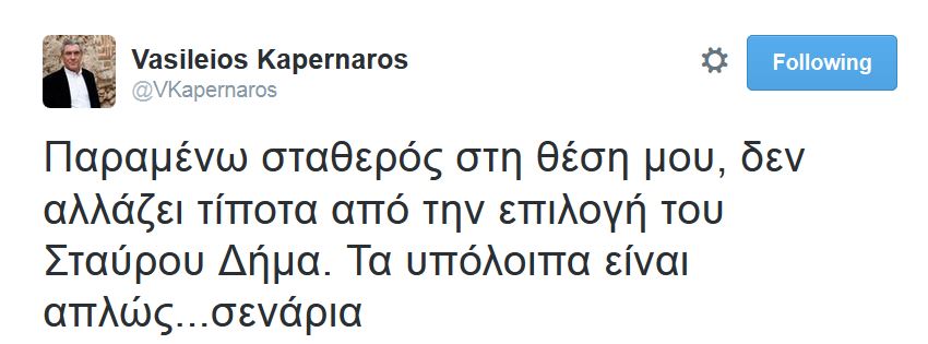 “Παραμένω σταθερός στη θέση μου, δεν αλλάζει τίποτα από την επιλογή του Σταύρου Δήμα. Τα υπόλοιπα είναι απλώς…σενάρια” έγραψε στο Twitter.
