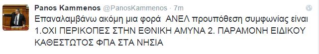 «Επαναλαμβάνω ακόμη μια φορά  ΑΝΕΛ προϋπόθεση συμφωνίας είναι 1. ΟΧΙ ΠΕΡΙΚΟΠΕΣ ΣΤΗΝ ΕΘΝΙΚΗ ΑΜΥΝΑ 2. ΠΑΡΑΜΟΝΗ ΕΙΔΙΚΟΥ ΚΑΘΕΣΤΩΤΟΣ ΦΠΑ ΣΤΑ ΝΗΣΙΑ», έγραψε ο κ. Καμμένος.