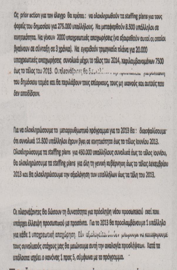 Θέτει μάλιστα ως προαπαιτούμενα για την εκταμίευση της δόσης την απόλυση 2.000 επιόρκων και την υπαγωγή 12.5000 υπαλλήλων στο καθεστώς της κινητικότητας έως τον Ιούνιο, ενώ ζητεί συγκεκριμένα τριμηνιαία πλάνα αποχωρήσεων έως το τέλος του 2014.