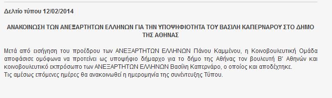 Η ανακοίνωση όπως δημοσιεύτηκε στην ιστοσελίδα των Ανεξάρτητων Ελλήνων: