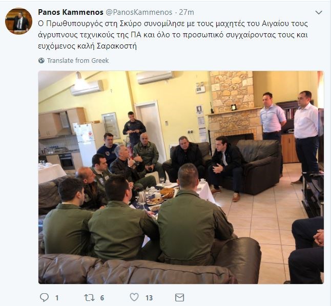 “Ο Πρωθυπουργός στη Σκύρο συνομίλησε με τους μαχητές του Αιγαίου τους άγρυπνους τεχνικούς της ΠΑ και όλο το προσωπικό συγχαίροντας τους και ευχόμενος καλή Σαρακοστή” ανέφερε σε ανάρτηση του στον προσωπικό του λογαριασμό στο Twitter ο κ. Καμμένος.