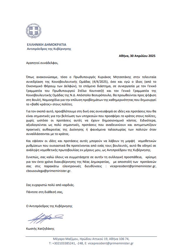 Στο πλαίσιο αυτό εντάσσεται και η επιστολή του Κωστή Χατζηδάκη προς όλους τους βουλευτές του κυβερνώντος κόμματος, που δημοσιοποιείται μέσω του ΑΠΕ-ΜΠΕ. Σε αυτήν υπενθυμίζεται εν πρώτοις ότι «τόσο ο Πρωθυπουργός Κυριάκος Μητσοτάκης στην τελευταία συνεδρίαση της Κοινοβουλευτικής Ομάδας (4/4/2025), όσο και εγώ ο ίδιος [σ.σ. ο Κ. Χατζηδάκης δηλαδή] (από το Οικονομικό Φόρουμ των Δελφών), το επόμενο διάστημα, σε συνεργασία με τον Γενικό Γραμματέα του Πρωθυπουργού Στέλιο Κουτνατζή και τον Γενικό Γραμματέα της Κοινοβουλευτικής Ομάδας της Ν.Δ. Απόστολο Βεσυρόπουλο, θα προωθούνται προς ψήφιση στη Βουλή, Νομοσχέδια για την επίλυση προβλημάτων της καθημερινότητας που δημιουργεί το “βαθύ κράτος” στους πολίτες».