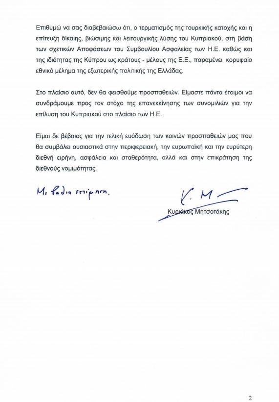 Επιθυμώ να σας διαβεβαιώσω ότι ο τερματισμός της τουρκικής κατοχής και η επίτευξη δίκαιης, βιώσιμης και λειτουργικής λύσης του Κυπριακού, στη βάση των σχετικών Αποφάσεων του Συμβουλίου Ασφαλείας των ΗΕ, καθώς και της ιδιότητας της Κύπρου ως κράτους – μέλους της ΕΕ, παραμένει κορυφαίο εθνικό μέλημα της εξωτερικής πολιτικής της Ελλάδας.