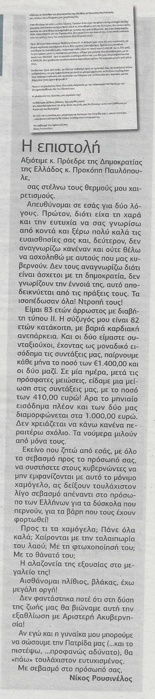 Με ανοιχτή επιστολή, γεμάτη οργή, ένας ηλικιωμένος απευθύνεται στον Πρόεδρο της Δημοκρατίας, διαπιστώνοντας μείωση, συνολικά 410 ευρώ, στη σύνταξη του ιδίου και της συζύγου του.