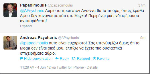 Εδώ και αρκετές εβδομάδες ανταλλάσσουν μηνύματα μέσω twitter οι υποψήφιοι Βουλευτές Ανδρέας Ψυχάρης και Δημήτρης Παπαδημούλης. Σε προηγούμενους διαλόγους κυριάρχησαν οι αιχμές για το Μέγκα. Τελικά οι δύο πολιτικοί θα συναντηθούν σε τηλεοπτικό σταθμό αλλά αυτός δεν θα είναι το Μέγκα.Διαβάστε τον σημερινό διάλογο