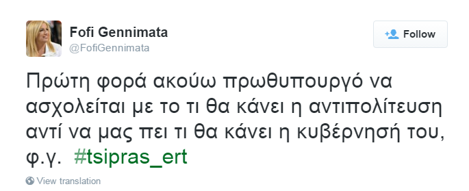 Δριμύ κατηγορώ απεύθυνε στον Αλέξη Τσίπρα η επικεφαλής της Δημοκρατικής Συμπαράταξης Φώφη Γεννηματά μέσω των social media με αφορμή την χθεσινοβραδινή  συνέντευξη του Πρωθυπουργού στην ΕΡΤ.
