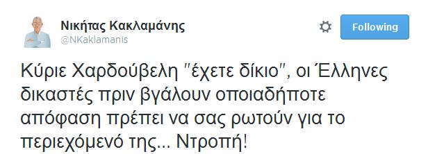 Με αφορμή τη δήλωση του υπουργού Οικονομικών, Γκίκα Χαρδούβελη, ότι οι πολιτικοί ασκούν δημοσιονομική πολιτική και όχι οι δικαστές, ο Νικήτας Κακλαμάνης έγραψε στο Twitter: “Κύριε Χαρδούβελη “έχετε δίκιο”, οι Έλληνες δικαστές πριν βγάλουν οποιαδήποτε απόφαση πρέπει να σας ρωτούν για το περιεχόμενό της… Ντροπή!”