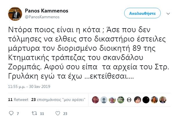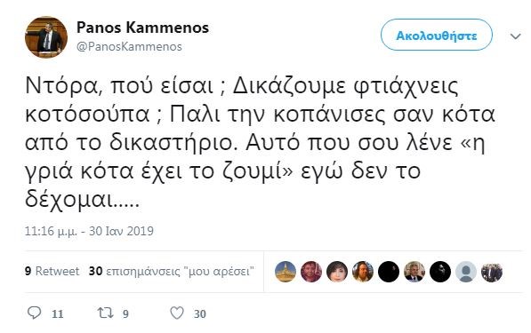 «Ντόρα, πού είσαι ; Δικάζουμε φτιάχνεις κοτόσουπα ; Πάλι την κοπάνησες σαν κότα από το δικαστήριο. Αυτό που σου λένε «η γριά κότα έχει το ζουμί» εγώ δεν το δέχομαι…», έγραψε στο twitter ο Πάνος Καμμένος.Σε νεότερη ανάρτηση έγραψε:«Ντόρα ποιος είναι η κότα ; Άσε που δεν τόλμησες να έλθεις στο δικαστήριο έστειλες μάρτυρα τον διορισμένο διοικητή 89 της Κτηματικής τράπεζας του σκανδάλου Ζορμπάς. Αφού σου είπα τα αρχεία του Στρ. Γρυλάκη εγώ τα έχω …εκτίθεσαι….»,