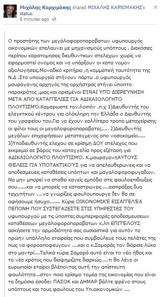 Επίθεση μέσω facebook, εξαπολύει ο Μιχάλης Καρχιμάκης στον υφυπουργό Οικονομικών, Γιώργο Μαυραγάνη, κάνοντας λόγο για «αρχηγό της ορχήστρας που στήνει το παρακράτος».