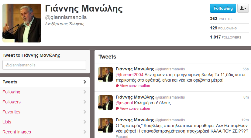 Ηλεκτρονική επίθεση εξαπέλυσε ο Γιάννης Μανώλης κατά του Φώτη Κουβέλη.Το στέλεχος των Ανεξάρτητων Ελλήνων, σχολίασε στον προσωπικό του λογαριασμό στο Twitter, τα όσα ανέφερε ο πρόεδρος της Δημοκρατικής Αριστεράς στην πρωινή εκπομπή του ΣΚΑΪ. «Ο ‘αριστερός’ Κουβέλης στα τηλεοπτικά παράθυρα: Δεν θα παρθούν νέα μέτρα! Η επαναδιαπραγμάτευση προχωράει! ΚΑΛΑ ΠΟΥ ΖΕΙ!», έγραψε ο κ. Μανώλης στη δήλωση του Φώτη Κουβέλη ότι δεν θα παρθούν νέα μέτρα.