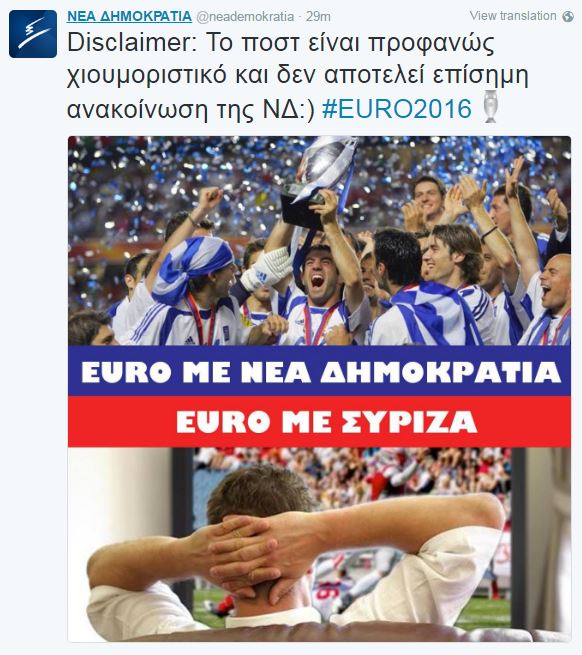 Με αφορμή την έναρξη του EURO, η Νέα Δημοκρατία ανέβασε στον λογαριασμό της στο Τwitter δύο φωτογραφίες, μία από το EURO 2004 όταν η Εθνική Ελλάδας στέφθηκε πρωταθλήτρια Ευρώπης και μία με έναν άνδρα να παρακολουθεί από τον καναπέ το EURO 2016.