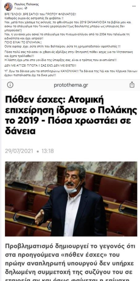Συγκεκριμένα, σε ανάρτησή του ο κ. Πολάκης ανέφερε: «ΒΡΕ ΓΕΛΟΙΟΙ ,ΒΡΕ ΣΑΠΙΟΙ του ΠΡΩΤΟΥ ΦΛΕΜΑΤΟΣ!! Καθαρός ουρανός αστραπές δε φοβάται!! Ναι, μετά που χάσαμε τις εκλογές, το φθινόπωρο του 2019 ΞΑΝΑ-ΑΝΟΙΞΑ τα βιβλία μου και ασκώ το επάγγελμα του Γενικού χειρούργου!!! (ως Βουλευτής μπορώ, ως υπουργός δεν μπορούσα!!). Ναι, η γυναίκα μου ασκεί το επάγγελμα του πνευμονολόγου από το 2004 που τελείωσε τη ειδικότητα και έχει ιατρείο!! ΠΟΙΟ ΕΙΝΑΙ ΤΟ ΕΓΚΛΗΜΑ;;; Ούτε οφσορ έχει, ούτε σπίτι του Βολταίρου, ούτε τη χρηματοδοτούν εφοπλιστές !!! Πόσο πολύ σας πόνεσαν οι χθεσινές εξελίξεις στην Επιτροπή πόθεν έσχες για το Μητσοτάκη και έχετε τρελαθεί!!! Η λάσπη έχει μπει στο γονίδιο της ύπαρξης σας, είναι ο τρόπος που αναπνέετε!!!».