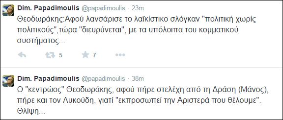 Επικριτικός απέναντι στον Σταύρο Θεοδωράκη και το Ποτάμι εμφανίστηκε μέσα από την προσωπική του σελίδα στο twitter, ο ευρωβουλευτής του ΣΥΡΙΖΑ, Δημήτρης Παπαδημούλης, με αφορμή τις προσχωρήσεις στελεχών στο Ποτάμι από άλλα κόμματα.