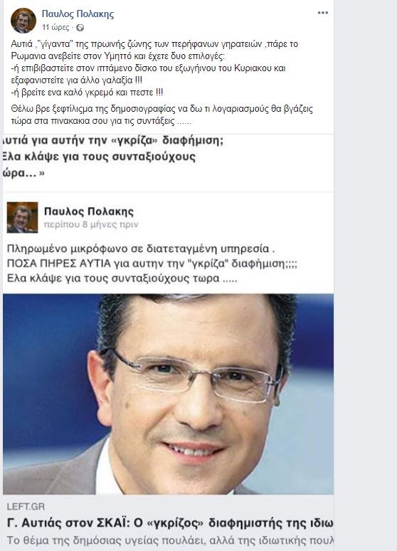 Επίθεση στον δημοσιογράφο Γιώργο Αυτιά, εξαπέλυσε μέσα από τον λογαριασμό του στο Facebook, ο αναπληρωτής υπουργός Υγείας, Παύλος Πολάκης.
