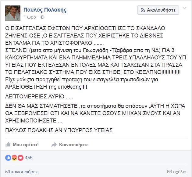 Πόλεμος έχει ξεσπάσει μετά τις κακουργηματικές διώξεις που ασκήθηκαν από την Εισαγγελία Πρωτοδικών Αθηνών κατά τριών μη πολιτικών προσώπων (υπαλλήλων) και κατά παντός άλλου υπευθύνου για τον διαγωνισμό που αφορούσε στην πρόσληψη ιατρών και νοσηλευτών στο ΚΕΕΛΠΝΟ προς στελέχωση των ΜΕΘ.Ο αναπληρωτής Υπουργός Υγείας, Παύλος Πολάκης επιτέθηκε με ανάρτησή του στο Facebook στον Εισαγγελέα που άσκησε τη δίωξη για τους διορισμούς στο ΚΕΕΛΠΝΟ.«Ο Εισαγγελέας Εφετών που αρχειοθέτησε το σκάνδαλο Siemens-OTE, ο Εισαγγελέας που χειρίστηκε το διεθνές ένταλμα για το Χριστοφοράκο… στέλνει( μετά από μήνυση του Γεωργιάδη-Τζαβάρα από τη ΝΔ) για 3 κακουργήματα και ένα πλημμέλημα 3 υπαλλήλους του Υπουργείου Υγείας που εκτέλεσαν εντολές μας και τσάκωσαν στα πράσα το πελατειακό σύστημα που είχε στηθεί στο ΚΕΕΛΠΝΟ!!!!», αναφέρει χαρακτηριστικά στην ανάρτησή του ο κ. Πολάκης. Και καταλήγει: «Είχε μάλιστα προηγηθεί πρόταση του Εισαγγελέα Πρωτοδικών για αρχειοθέτηση της υπόθεσης!!!! Λεπτομέρειες αύριο…. Δεν θα μας σταματήσετε, τα αποστήματα θα σπάσουν, αυτή η χώρα θα ξεβρωμίσει ό,τι κι να κάνετε, όσους μηχανισμούς και αν χρησιμοποιήσετε…».Δείτε την ανάρτηση του κ. Πολάκη: