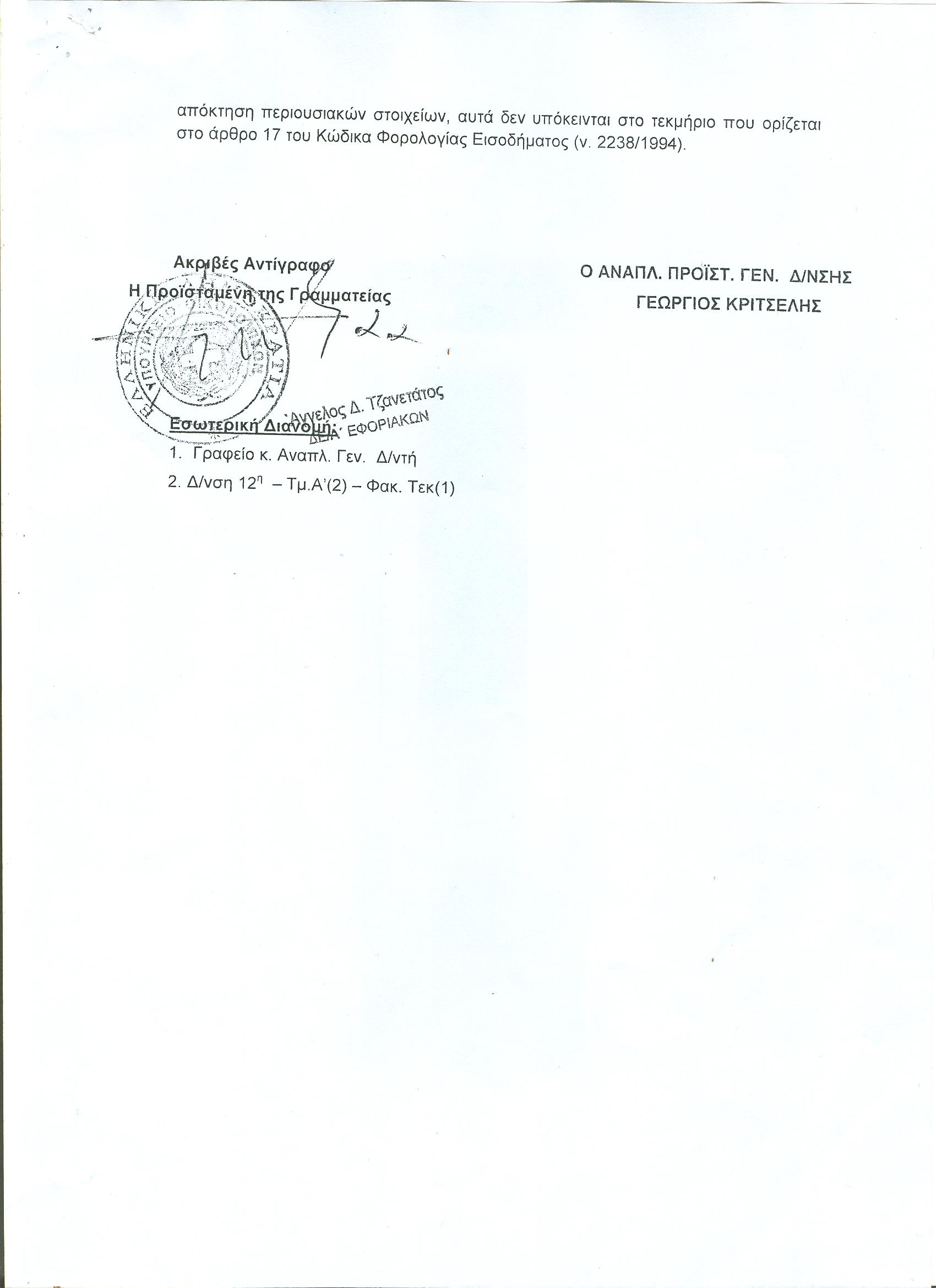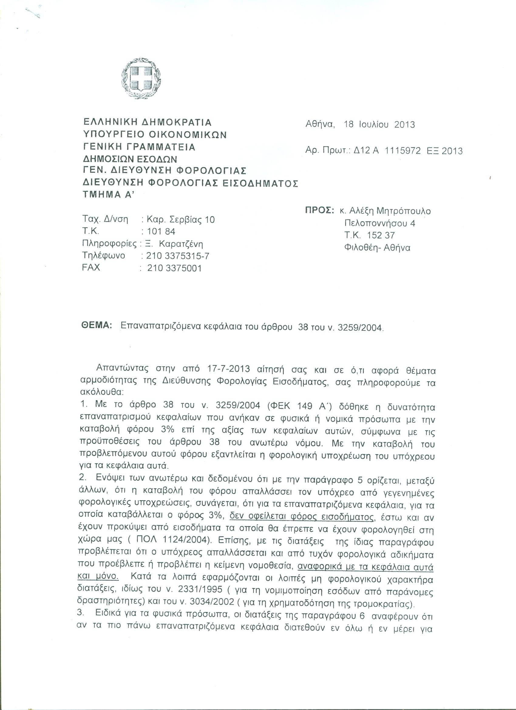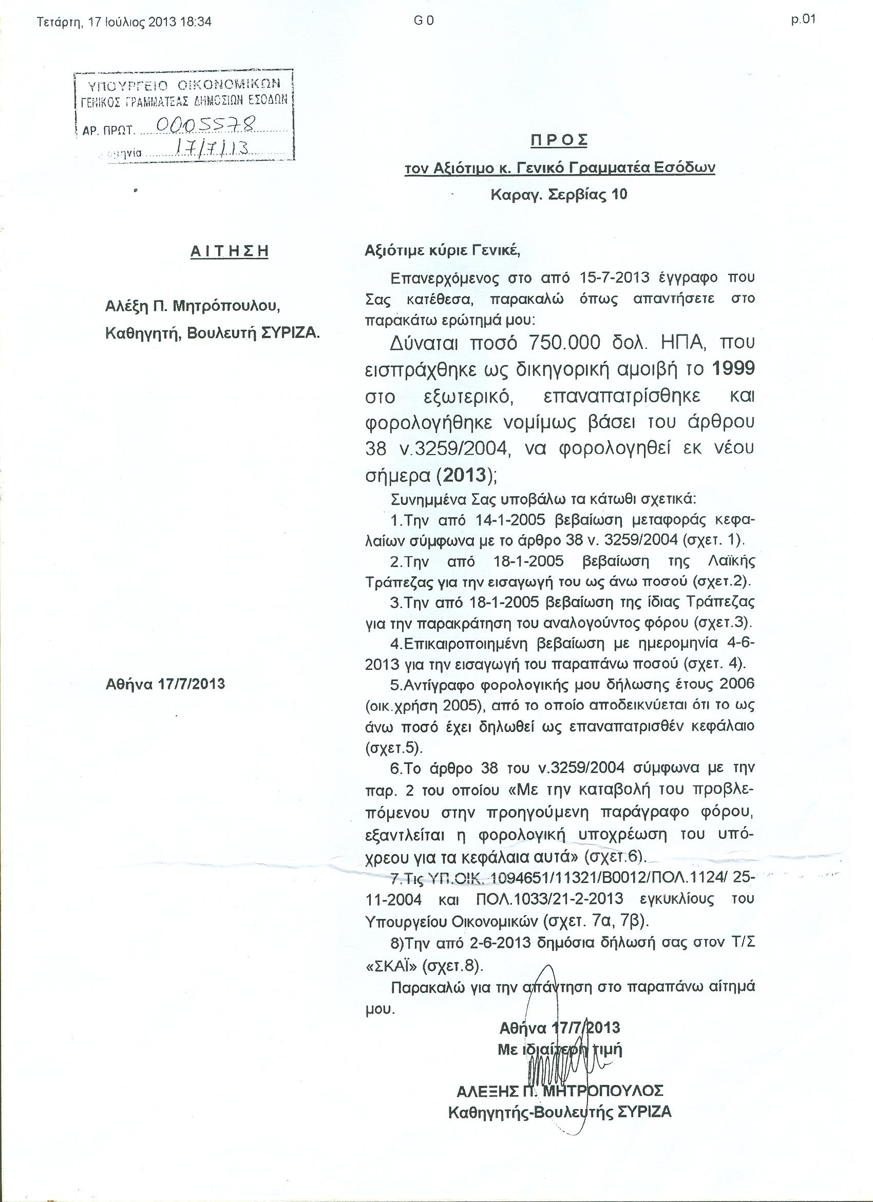 Τέλος, αναφορικά με τη φορολογική υπόθεση για την οποία ελέγχεται, δίνει «στη δημοσιότητα σχετικό απαντητικό έγγραφο του Υπουργείου Οικονομικών (Γενική Δ/νση Φορολογίας Εισοδήματος) που επιβεβαιώνει την αλήθεια των ισχυρισμών μου. Δίνω εκ νέου και την από 15-10-2013 δήλωσή μου. Επιφυλάσσομαι να επανέλθω για να δώσω περαιτέρω διευκρινίσεις και έγγραφα. Πρόθεσή μου πάντα είναι να λάμψει η αλήθεια».