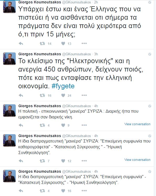 «Υπάρχει έστω και ένας Έλληνας που να πιστεύει ή να αισθάνεται οτι σήμερα τα πράγματα δεν είναι πολύ χειρότερα από ό,τι πριν 15 μήνες;», αναφέρει σε ένα από τα tweets του το στέλεχος της Αξιωματικής αντιπολίτευσης.