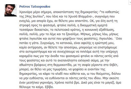 “Χρονιάρα μέρα σήμερα, αποκατάσταση της δημοκρατίας -“το καθεστώς της 24ης Ιουλίου”, που λένε και τα Χρυσά Βλαμμένα-, συγγνώμη που ενοχλώ, μια απορία έχω, αν θέλετε μου απαντάτε. ΟΚ, για όλη αυτή τη στροφή προς το φασισμό, φταίνε πολλά, η δικομματική ομερτά τεσσάρων δεκαετιών, το πελατειακό κράτος, η κοινωνική εξαθλίωση, πολλά, πολλά, μην τα λέμε και τα ξαναλέμε. Μήπως, μήπως λέω, μήπως φταίνε λιγουλάκι και αυτοί που ψηφίζουν τους φασίστες; Λιγουλάκι. ΄Οσο πατάει η γάτα. Συγγνώμη, το κατανοώ, είναι αφελής η ερώτησή μου, καμία αντίρρηση, αν θέλετε την αποσύρω, μπορούμε να επιστρέψουμε στο αυτομαστίγωμα και να συνεχίσουμε να πιπιλάμε αυτή την υπέροχη καραμέλα πως για την άνοδο του φασισμού φταίνε οι πάντες εκτός από τους φασίστες και αυτό το ανεπανάληπτο εκλογικό σώμα, με την αθωότητα βρέφους στη θερμοκοιτίδα, με τη σοφία γέροντα στο Θιβέτ, μπορεί, αν θέλει να μας τιμωρήσει, να ψηφίσει κι εναντίον της δημοκρατίας, να κόψει το κλαδί που κάθεται και, ω του θαύματος, διόλου να μην ευθύνεται, να ευθύνονται οι πάντες εκτός του ιδίου. Μην ακούτε έναν μεσήλικα γκρινιάρη. Χρόνια πολλά βρε. Δικό μας είναι το μαγαζί, άμα θέλουμε το καίμε. Εβίβα”, ήταν το σχόλιο του βουλευτή του ΣΥΡΙΖΑ.