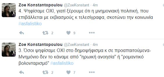 “Όσοι ψηφίσαμε ΟΧΙ στο δημοψήφισμα κ σε προαπαιτούμενα-Μνημόνιο δεν το κάναμε από “ηρωική ανοησία” ή “ρομαντικό βολονταρισμό” ασφαλιστικό. Ψηφίσαμε ΟΧΙ, γιατί ξέρουμε ότι η μνημονιακή πολιτική, που επιβάλλεται με εκβιασμούς κ τελεσίγραφα, σκοτώνει την κοινωνία” συνέχισε η πρώην πρόεδρος της βουλής.