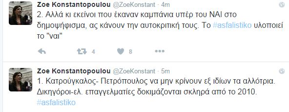 “Κατρούγκαλος- Πετρόπουλος να μην κρίνουν εξ ιδίων τα αλλότρια. Δικηγόροι-ελεύθεροι επαγγελματίες δοκιμάζονται σκληρά από το 2010. Αλλά κι εκείνοι που έκαναν καμπάνια υπέρ του ΝΑΙ στο δημοψήφισμα, ας κάνουν την αυτοκριτική τους. Το ασφαλιστικό υλοποιεί το “ναι”‘ έγραψε η κ. Κωνσταντοπούλου.