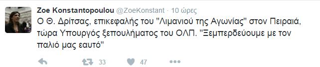 «Ο Θεόδωρος Δρίτσας, επικεφαλής του “Λιμανιού της Αγωνίας” στον Πειραιά, τώρα Υπουργός ξεπουλήματος του ΟΛΠ. “Ξεμπερδεύουμε με τον παλιό μας εαυτό”».