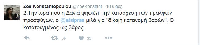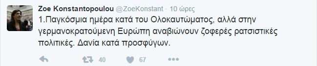 Επίθεση στον Πρωθυπουργό Αλέξη Τσίπρα και στην “γερμανοκρατούμενη Ευρώπη” εξαπολύει η πρώην Πρόεδρος της Βουλής Ζωή Κωνσταντοπούλου, με αφορμή το προσφυγικό. Διαβάστε αναλυτικά όσα έγραψε η Ζωή Κωνσταντοπούλου στο Twitter: