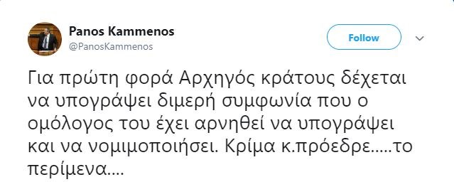 Με ανάρτησή του στο twitter ο πρόεδρος των ΑΝΕΛ και τέως υπουργός Εθνικής Άμυνας Πάνος Καμμένος απευθύνεται στον Πρόεδρο της Δημοκρατίας επειδή υπέγραψε το κείμενο της Συμφωνίας των Πρεσπών ώστε να πάρει ΦΕΚ στη συνέχεια.