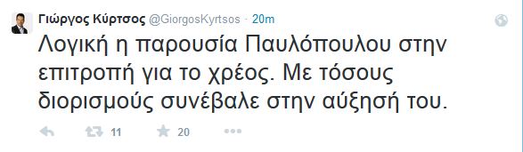 Κριτική στον Πρόεδρο της Δημοκρατίας, Προκόπη Παυλόπουλο, με αφορμή την παρουσία του στην Επιτροπή για το χρέος, ασκεί ο ευρωβουλευτής της Νέας Δημοκρατίας, Γιώργος Κύρτσος, με ανάρτηση που έκανε στο Twitter. Συγκεκριμένα, ο κ. Κύρτσος έγραψε: «Λογική η παρουσία Παυλόπουλου στην επιτροπή για το χρέος. Με τόσους διορισμούς συνέβαλε στην αύξησή του».