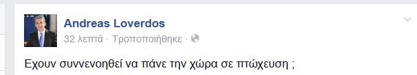 Πυρά κατά του Γιάνη Βαρουφάκη εξαπέλυσε μέσω Facebook, ο Ανδρέας Λοβέρδος. Ο πρώην υπουργός αναφερόμενος σε παλαιότερο άρθρο του υπουργού Οικονομικών έκανε το ακόλουθο σχόλιο: «Έχουν συνεννοηθεί να πάνε την χώρα σε πτώχευση;».