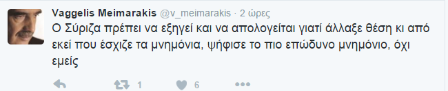 Συγκεκριμένα, έγραψε: «Ο Σύριζα πρέπει να εξηγεί και να απολογείται γιατί άλλαξε θέση κι από εκεί που έσχιζε τα μνημόνια, ψήφισε το πιο επώδυνο μνημόνιο, όχι εμείς».