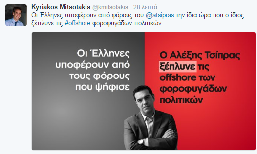 O κ. Μητσοτάκης έγραψε: Οι Έλληνες υποφέρουν από φόρους του Αλέξη Τσίπρα την ίδια ώρα που ο ίδιος ξέπλυνε τις offshore φοροφυγάδων πολιτικών.