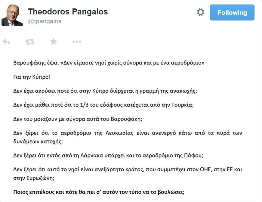 «Δεν έχει ακούσει ποτέ ότι στην Κύπρο διέρχεται η γραμμή της ανακωχής; Δεν έχει μάθει ποτέ ότι το 1/3 του εδάφους κατέχεται από την Τουρκία; Δεν του μοιάζουν με σύνορα αυτά του Βαρουφάκη; Δεν ξέρει ότι το αεροδρόμιο της Λευκωσίας είναι ανενεργό κάτω από τα πυρά των δυνάμεων κατοχής; Δεν ξέρει ότι εκτός από τη Λάρνακα υπάρχει και το αεροδρόμιο της Πάφου; Δεν ξέρει ότι αυτό το νησί είναι ανεξάρτητο κράτος, που συμμετέχει στον ΟΗΕ, στην ΕΕ και στην Ευρωζώνη;».