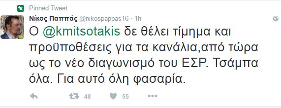 “O κ. Μητσοτάκης δεν θέλει τίμημα και προϋποθέσεις για τα κανάλια,από τώρα ως το νέο διαγωνισμό του ΕΣΡ. Τσάμπα όλα. Για αυτό όλη φασαρία” έγραψε ο κ. Παππάς και συνέχισε:
