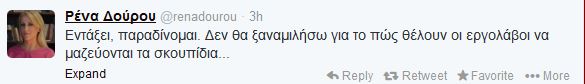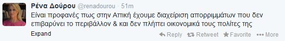 «Αλλιώς μαζεύει τα σκουπίδια ένας μνημονιακός και αλλιώς ένας αντιμνημονιακός» δήλωσε η υποψήφια του ΣΥΡΙΖΑ για την περιφέρεια Αττικής, Ρένα Δούρου, αφήνοντας υπόνοιες για εργολαβικά συμφέροντα. Όπως ήταν αναμενόμενο η φράση αυτή προκάλεσε θύελλα αντιδράσεων αλλά και διάφορων σχολίων στο Twitter, με την Ρένα Δούρου να επιχειρεί να κατευνάσει τα πνεύματα.