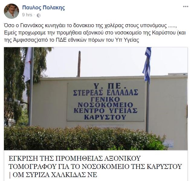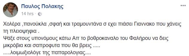 Επίθεση στον πρόεδρο της ΠΟΕΔΗΝ Μιχάλη Γιαννάκο εξαπέλυσε o αναπληρωτής υπουργός Υγείας Παύλος Πολάκης με αφορμή την καταγγελία της Ομοσπονδίας των Εργαζομένων στα Δημόσια Νοσοκομεία ότι ανιχνεύθηκε το βακτήριο της χολέρας σε καλλιέργεια δείγματος του νερού από το υπόγειο της αποθήκης τροφίμων του μαιευτηρίου «Έλενα».