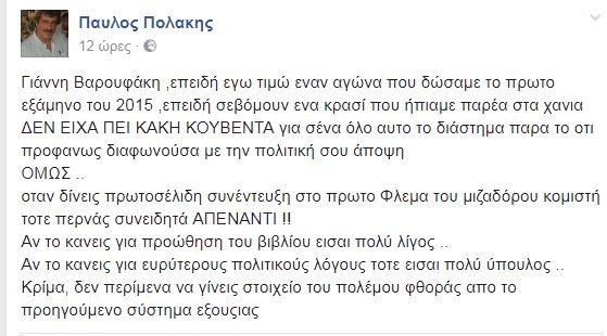«Γιάννη Βαρουφάκη, επειδή εγώ τιμώ έναν αγώνα που δώσαμε το πρώτο εξάμηνο του 2015, επειδή σεβόμουν ένα κρασί που ήπιαμε παρέα στα Χανιά