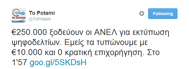 Το Ποτάμι, στον επίσημο λογαριασμό του στο Twitter έγραψε: €250.000 ξοδεύουν οι ΑΝΕΛ για εκτύπωση ψηφοδελτίων. Εμείς τα τυπώνουμε με €10.000 και 0 κρατική επιχορήγηση…