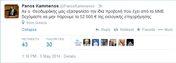 Από τη μεριά του ο Πάνος Καμμένος έγραψε στο Twitter: Αν ο θεοδωράκης μας εξασφαλίσει την ίδια προβολή που έχει από τα ΜΜΕ δεχόμαστε να μην πάρουμε τα 52.000 ευρώ της εκλογικής επιχορήγησης.