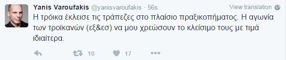Την τρόικα κατηγόρησε για το κλεισιμο των τραπέζων, μέσω ανάρτησης του στο twitter, ο πρώην υπουργός Οικονομικών, Γιάνης Βαρουφάκης, κάνοντας λόγο για “πραξικόπημα”. O κ. Βαρουφάκης έγραψε ότι τον τιμά ιδιαίτερα “η αγωνία των τροϊκανών (εξωτερικού και εσωτερικού) να του χρεώσουν το κλείσιμο τους”.