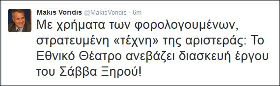 «Με χρήματα των φορολογουμένων, στρατευμένη «τέχνη» της αριστεράς: Το Εθνικό Θέατρο ανεβάζει διασκευή έργου του Σάββα Ξηρού!», έγραψε ο βουλευτής της Νέας Δημοκρατίας.